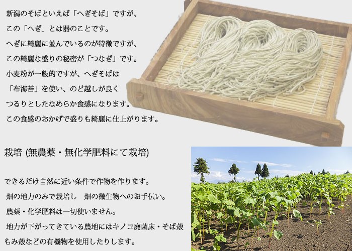 新潟のそばといえば「へぎそば」ですが、この「へぎ」とは器のことです。へぎにきれいに並んでいるのが特徴ですが、このきれいな盛りの秘密が「つなぎ」です。小麦粉が一般的ですが、へぎそばは「布海苔」を使い、喉ごしがよくつるりとしたなめらかな食感になります。この食感のおかげで盛りもきれいに仕上がります。